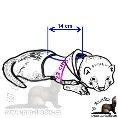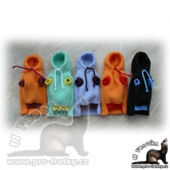 Fleece bavlněná bunda pro fretky. Na krku vzadu pod kapucí je otvor, kterým lze provléct kroužek postroje pro připnutí vodítka.